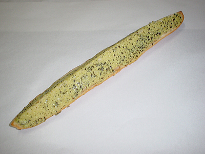 食欲増進や、リフレッシュ効果のあるオリーブオイル入りバジルの葉をバケットに塗り、香りが程よく出るまで焼きました。